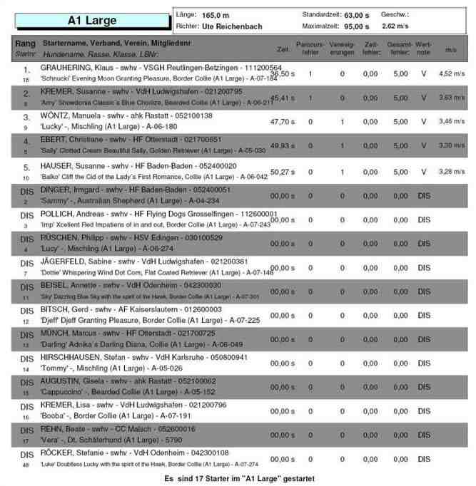 Hallo Klaus, mit deiner Einschätzung zum A1 Parcour liegst du total richtig. Viiiel zu schwer. Man muß ja auch mal bedenken, dass es auch Hundführer gibt, die selbst ihren ersten Hund führen. Die Anforderungen in diese "Anfängerklasse" waren eindeutig zu hoch. Was man auch noch erwähnen kann sind die super guten Bodenverhältnisse auf dem Platz. Trotz zweier Turniertagen und Dauerregen von Samstag auf Sonntag war der Rasen in sagenhaft gutem Zustand. Nach dem Turnier konnte man fast keine Laufwege oder gar matschige Stellen finden. Ein riesen Lob an den Verein ist hier sicherlich angebracht. Wir kommen auf jeden Fall nächstes Jahr gerne wieder. Grüßle Moni
