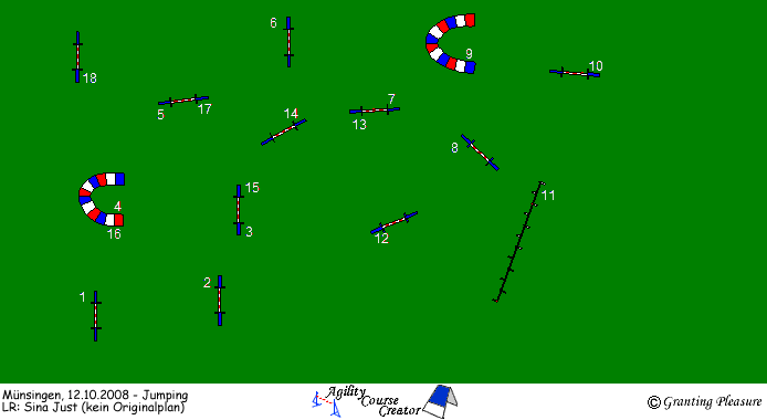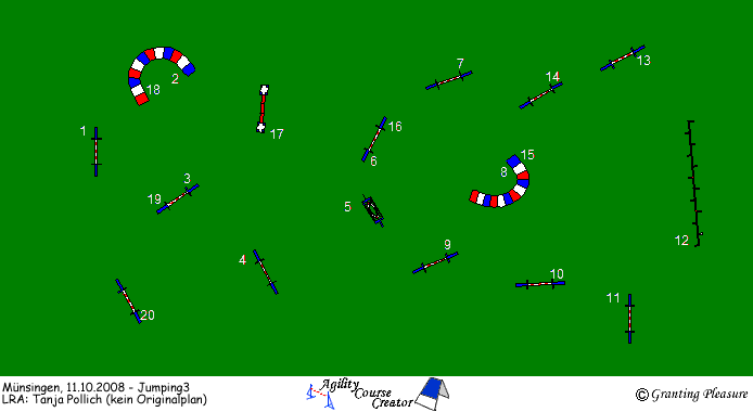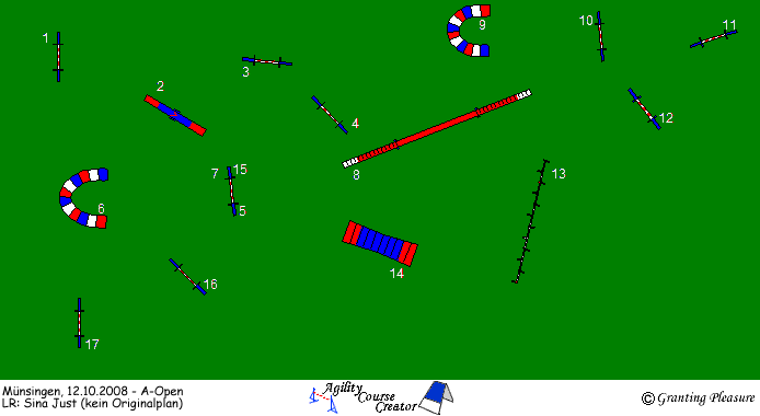 Beim Jumping-Parcours machten mir zwei Stellen etwas Sorgen. Um den Hund nicht innen an der Hürde 4 vorbei zu ziehen muß man sie ordentlich anlaufen, nur, wie kommt dann Unsereiner noch nach vorne für die Sequenz Hürde 6 - 7 und wo läuft man nach dem Tunnel 15, rechts oder links oder schafft man einen Wechsel? Bis zur Mauer 17 lief es super. Offensichtlich habe ich da etwas die Übersicht verloren, denn ich hörte nur, wie ein Mauerziegel gefallen ist, gesehen habe ich es nicht. Schade, denn der übrige Lauf war für unsere Verhältnisse sehr, sehr gut. (16 Starter, 3 V0, 2 V, 2 SG, 1 G, 1 oB, 7 Dis).
