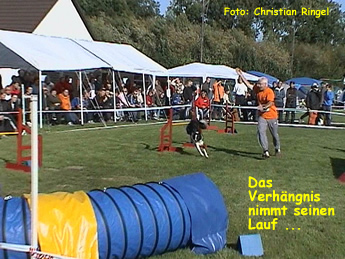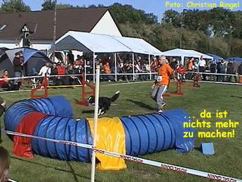 Welle nach dem Slalom. Bei 65 Startern gab es 27 Dis. Viele Hunde sind nach Hürde 8 im Ausgang vom Tunnel 9 verschwunden,