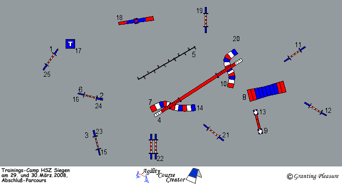 Ich habe den Parcour im Training gestell - die meisten sind verzweifelt :-) Ich habe denen dann die Adresse vom Riedelhof gegeben - damit die ensprechenden Beschwerden gleich an die richtige Stelle weiter geleitet werden.... Webmaster: In diesem Zusammenhang fällt mir ein, daß ich ja ganz vergessen zu erwähnen, wir sind die nächsten drei Monate nicht zu Hause.